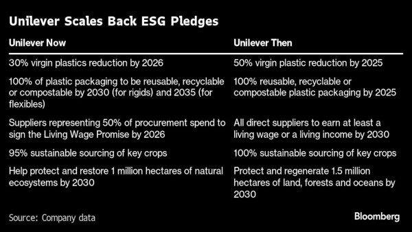 Unilever Plc plans to abandon or water down a string of environmental and social pledges against the backdrop of a growing backlash from investors, consumers and politicians against companies pursuing non-financial objectives. The move by Hein Schumacher, Unilever’s chief executive officer, marks a major shift for the £95 billion ($118 billion) consumer group.